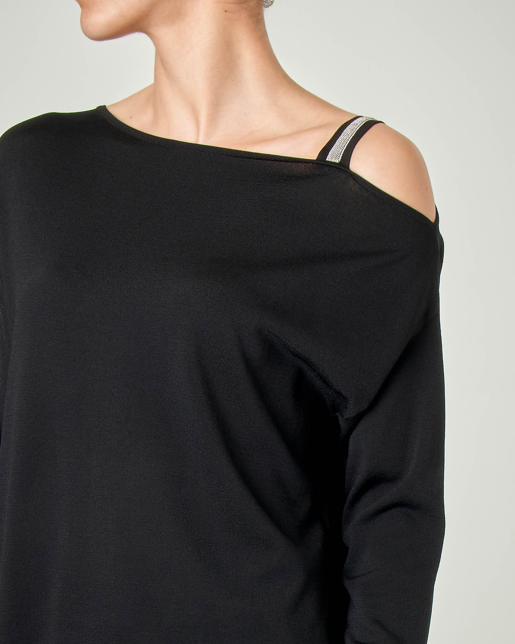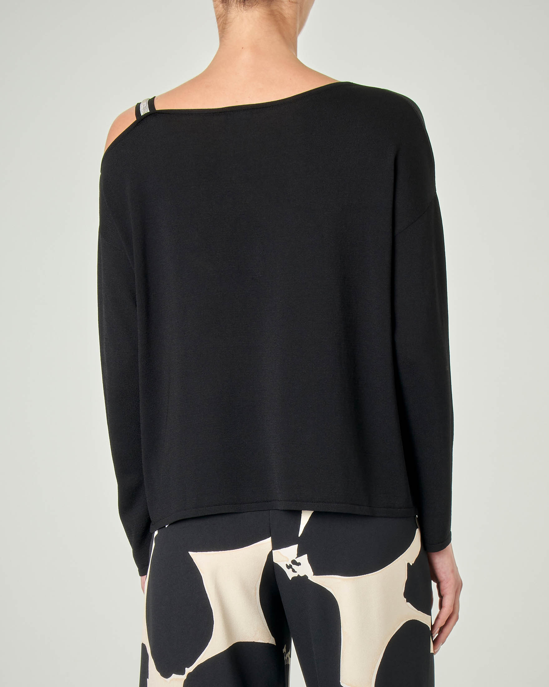T shirt girocollo a spalla scesa con polsino alto in jersey di cotone. Pullover in maglia di lana merino extrafine con scollo a barca rivoltato con effetto a spalla scesa e maniche lunghe a calla.