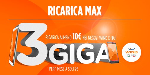 Con ricarica max ha subito 3gb in più da usare entro 30 giorni a soli 2 euro. 3 gb a soli 2 euro. 3 giga per 1 mese a 2 euro per chi fa una ricarica di almeno 10 euro nei negozi wind. Attivi ora rispondendo 3gb si a questo sms oppure vada in negozio esclusivo wind.